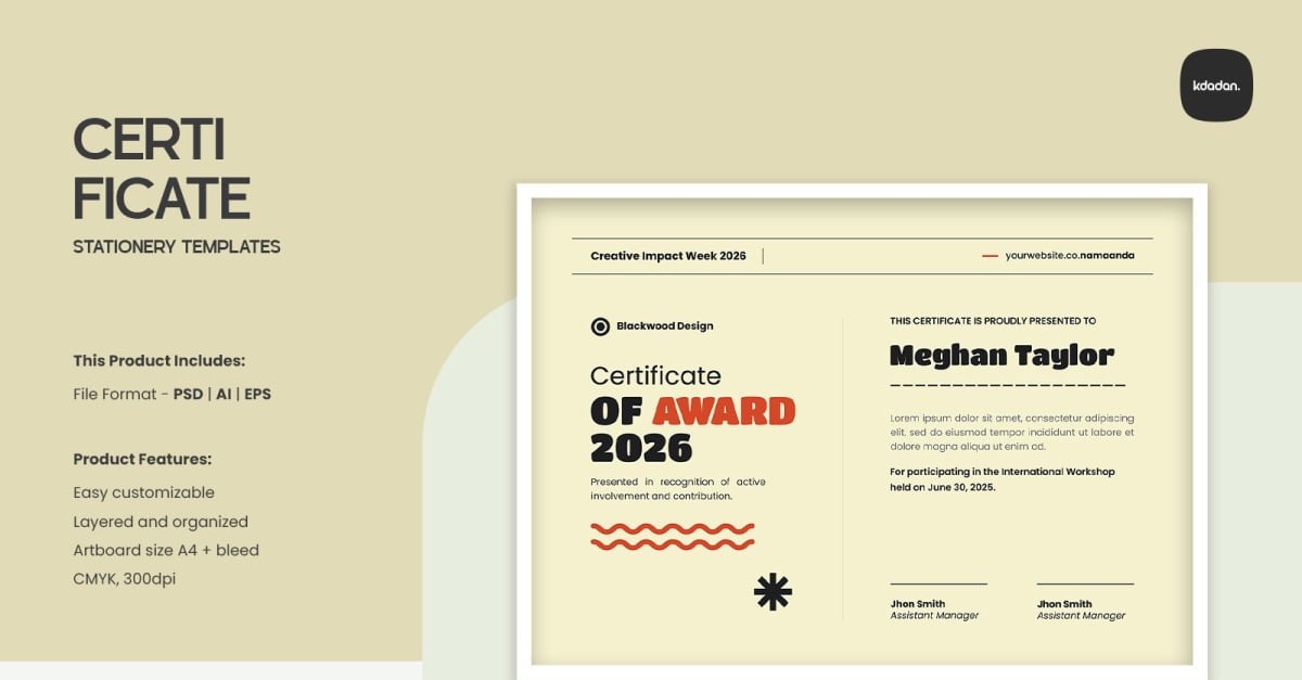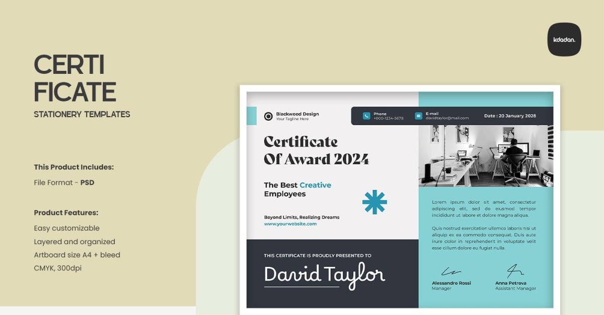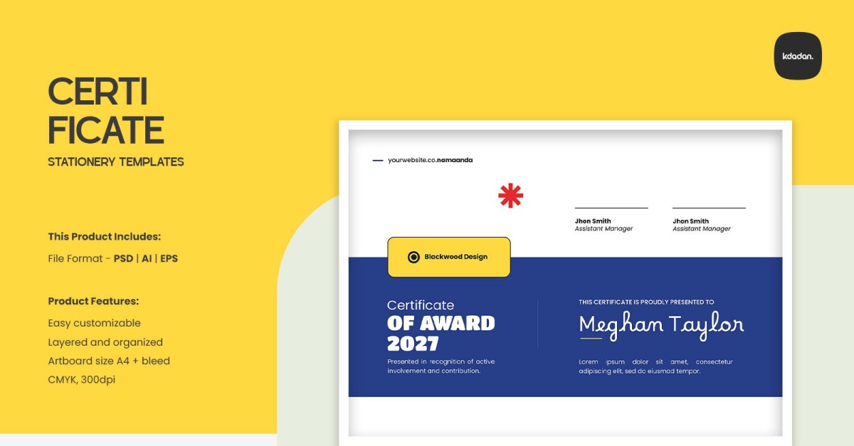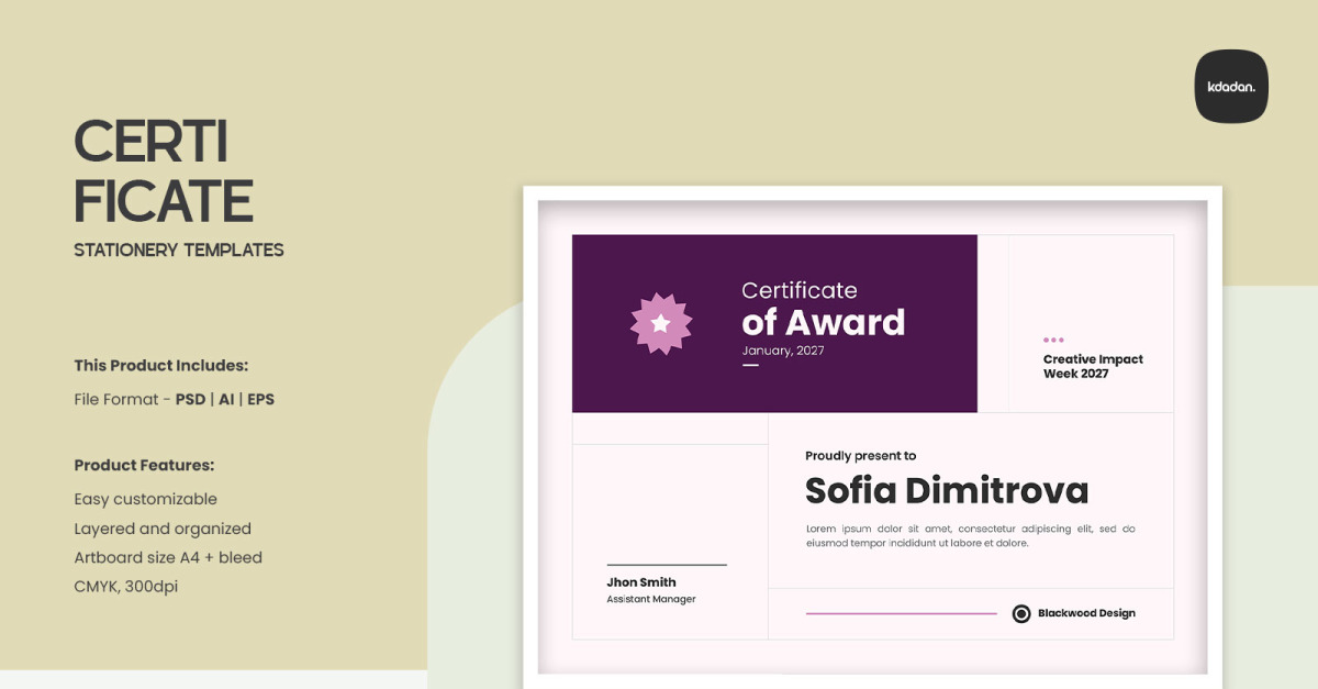 Overview : Clean, Modern and Professional Certificate. Fully customizable, easy to use and replace colors & text, logo containers are Smart-Objects to make it easy for you to add logo and edit files. This Product Includes: – Compatible files for Adobe Photoshop CS/CC – Help Files Product Features: – Fully customizable and editable PSD template…